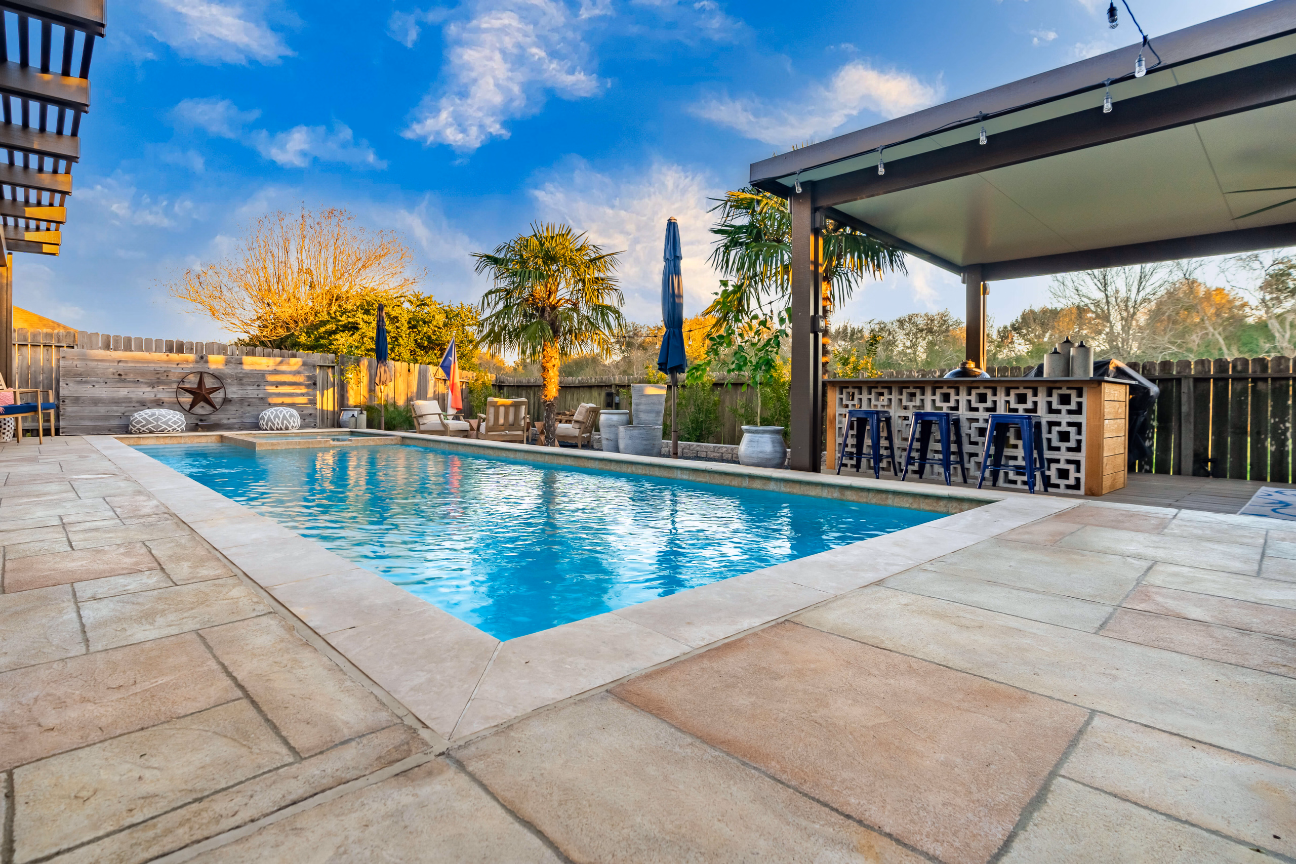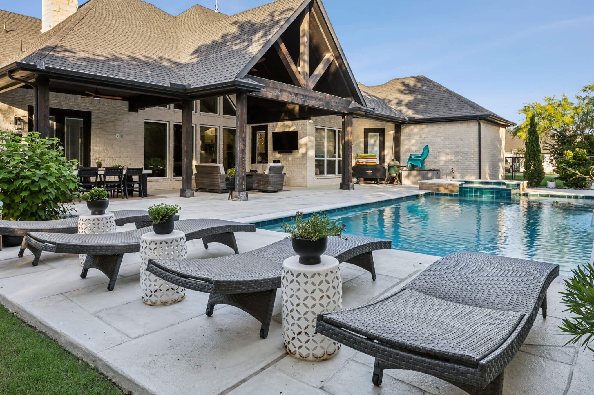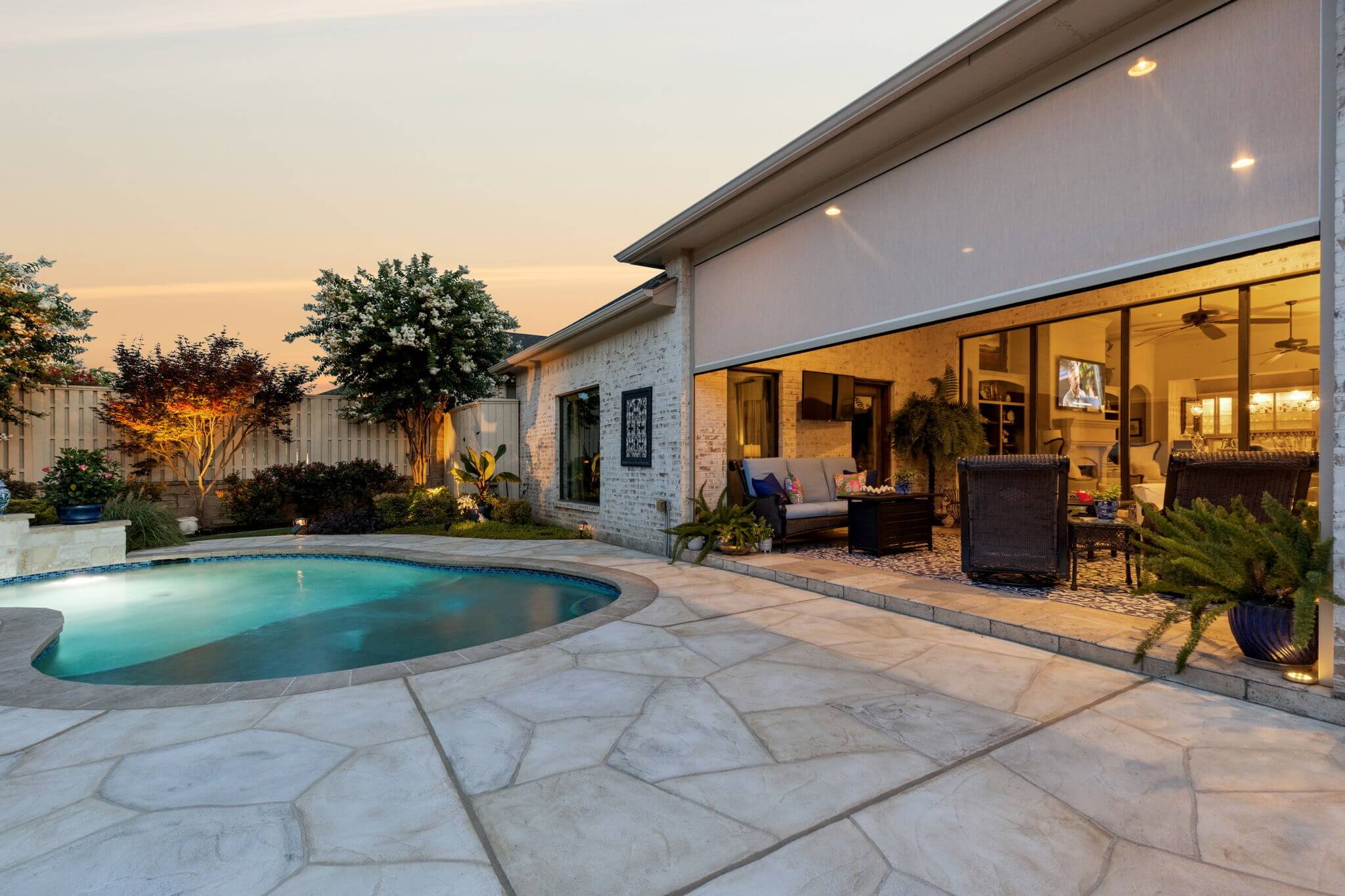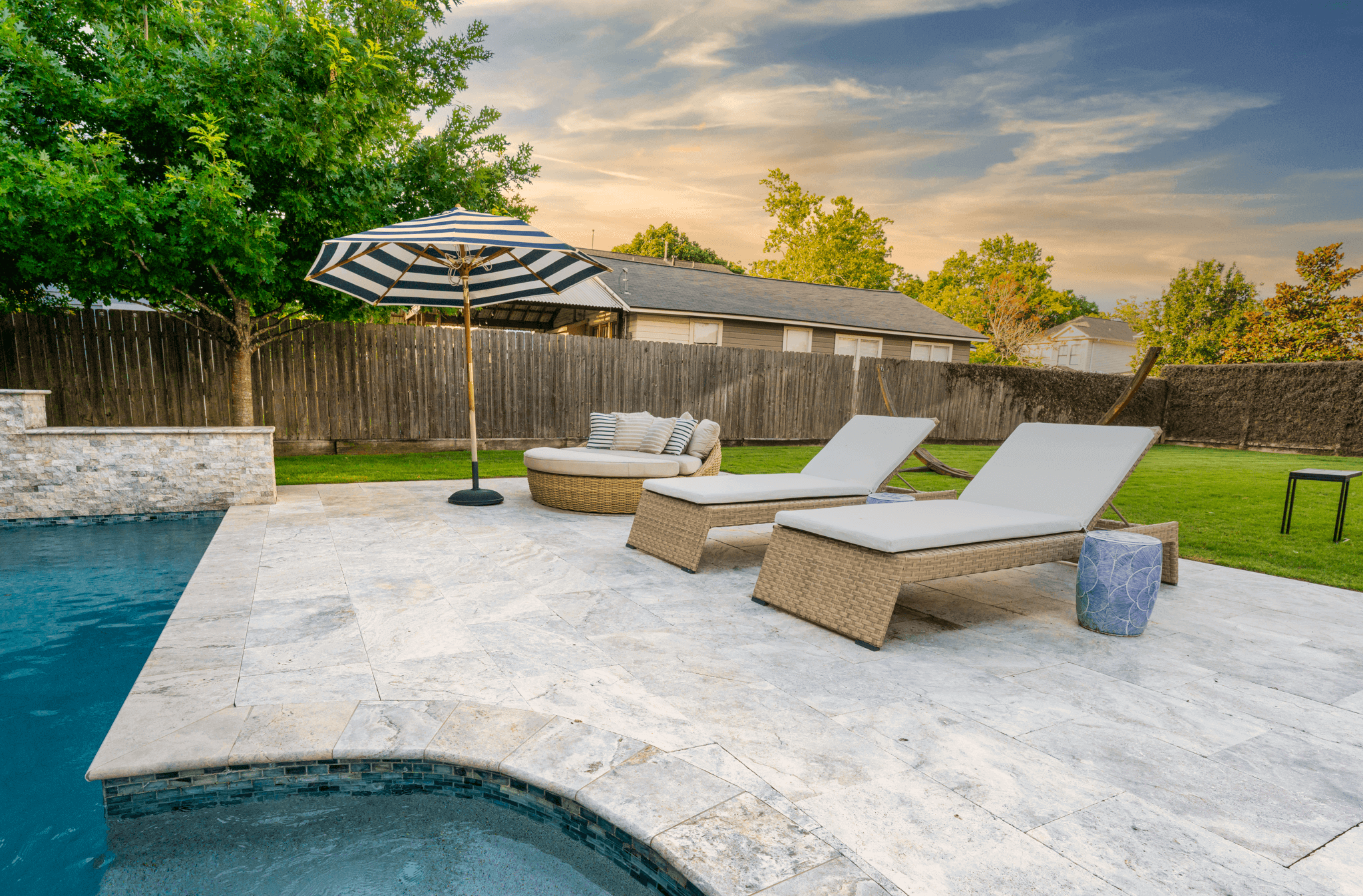 Relaxing Outdoor Living AreaBackyard Patio Hangout SpaceSerene Backyard Patio RetreatNeutral Carvestone Pool Deck