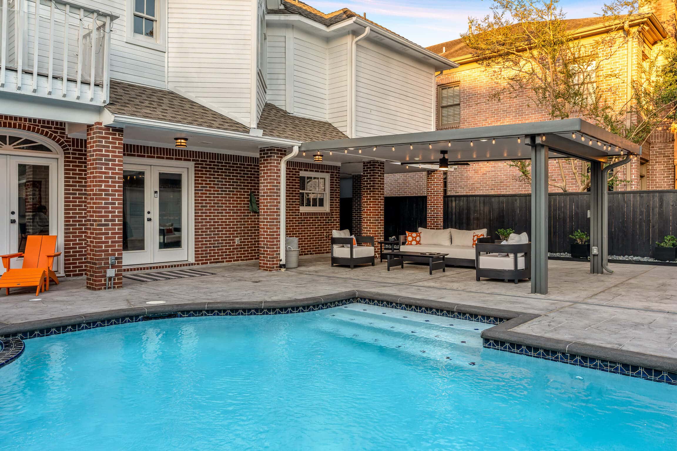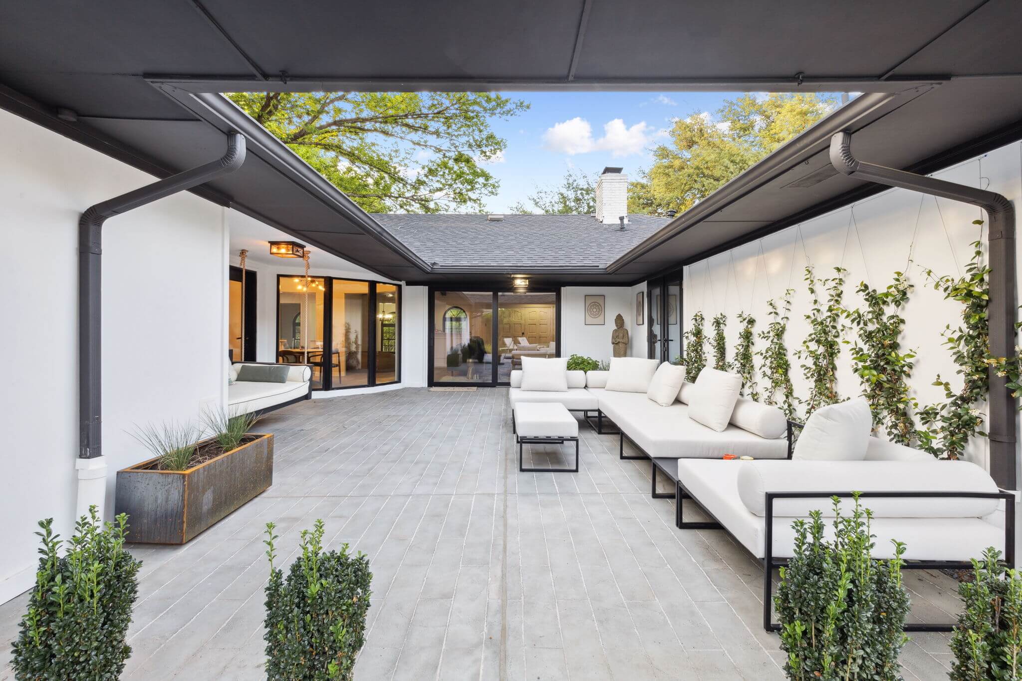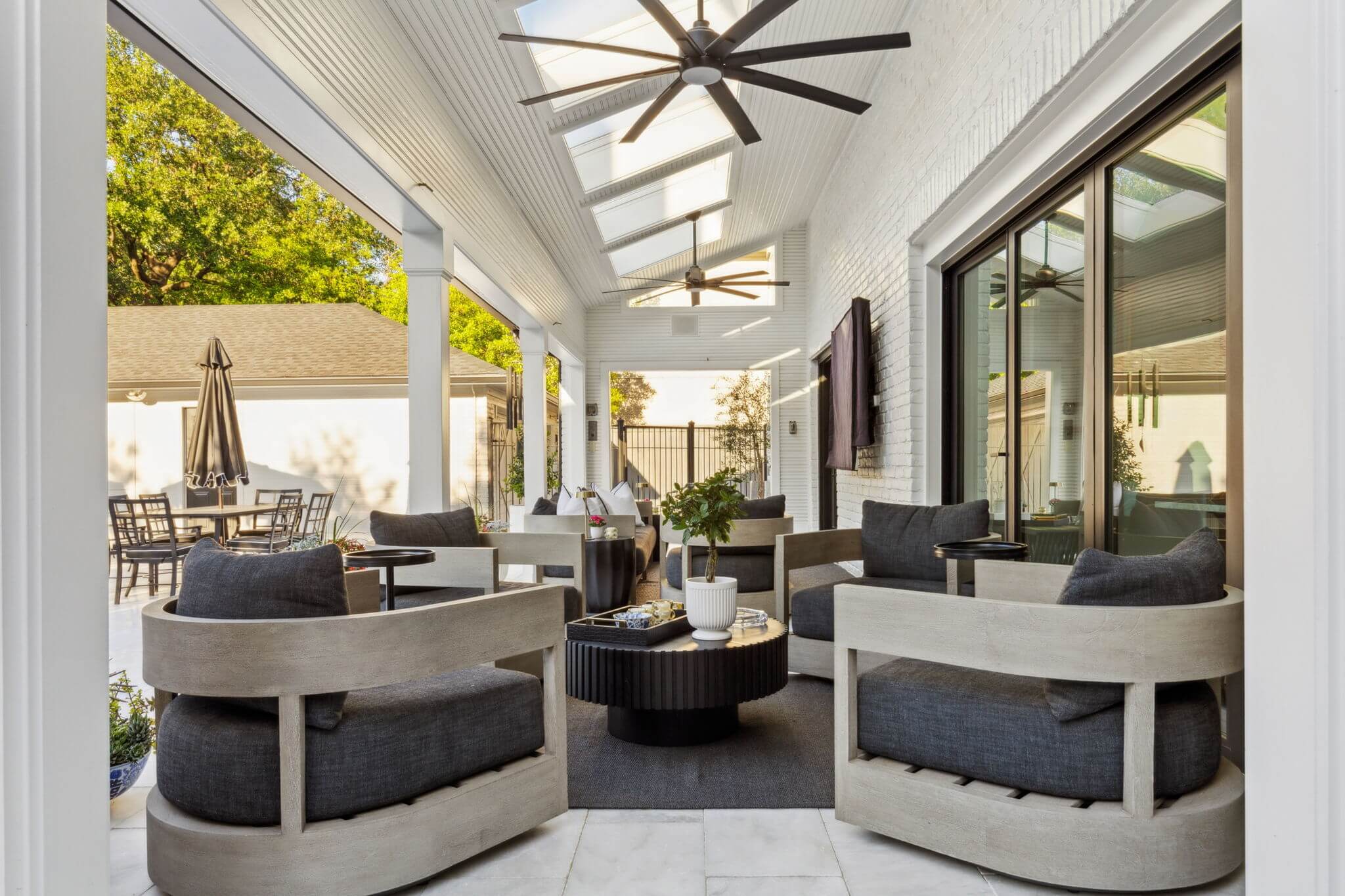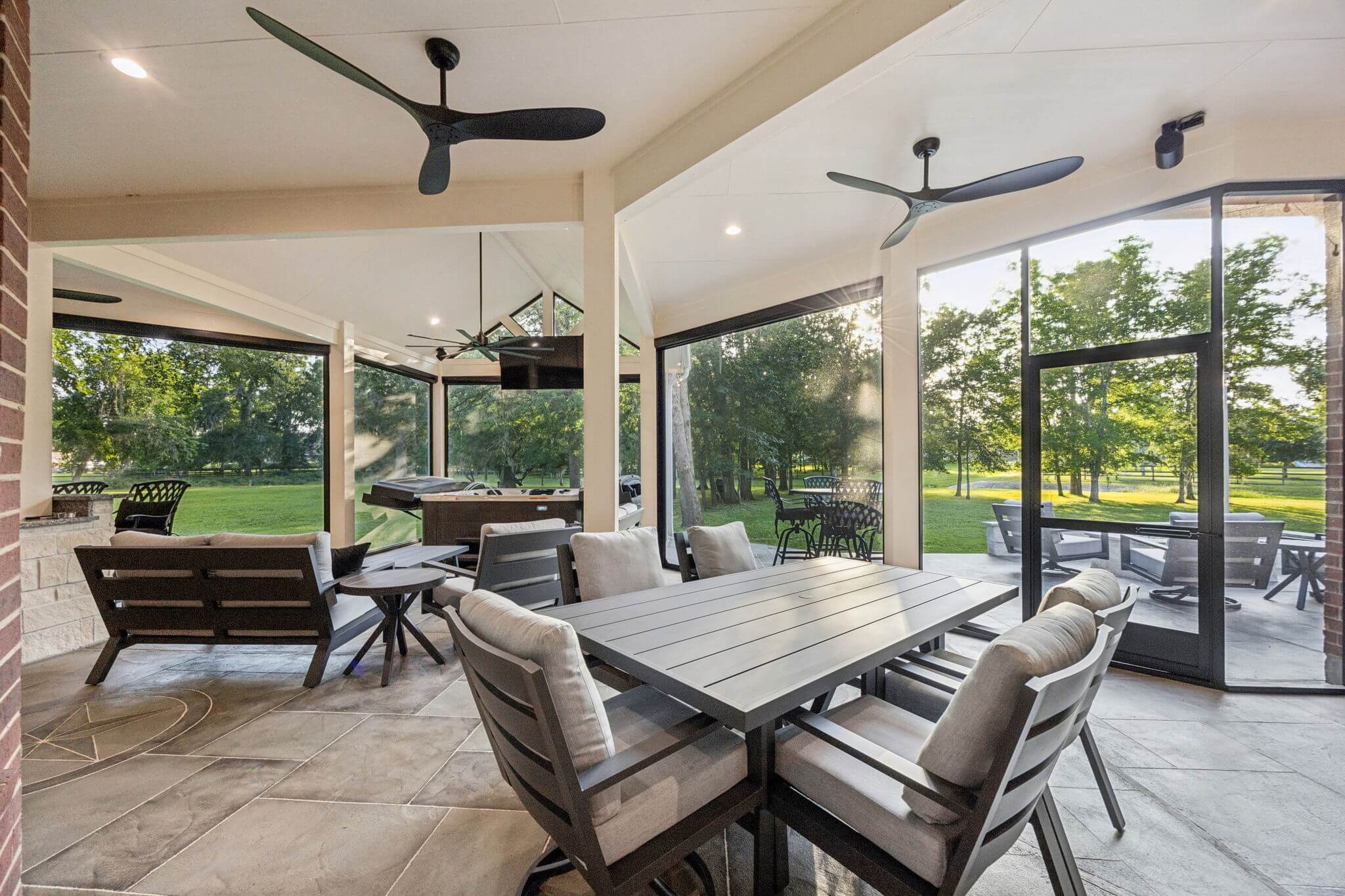 Modern Outdoor Living RoomExpanded Patio RetreatPersonal Backyard Retreat in HoustonAluminum Pergola on Carvestone Patio