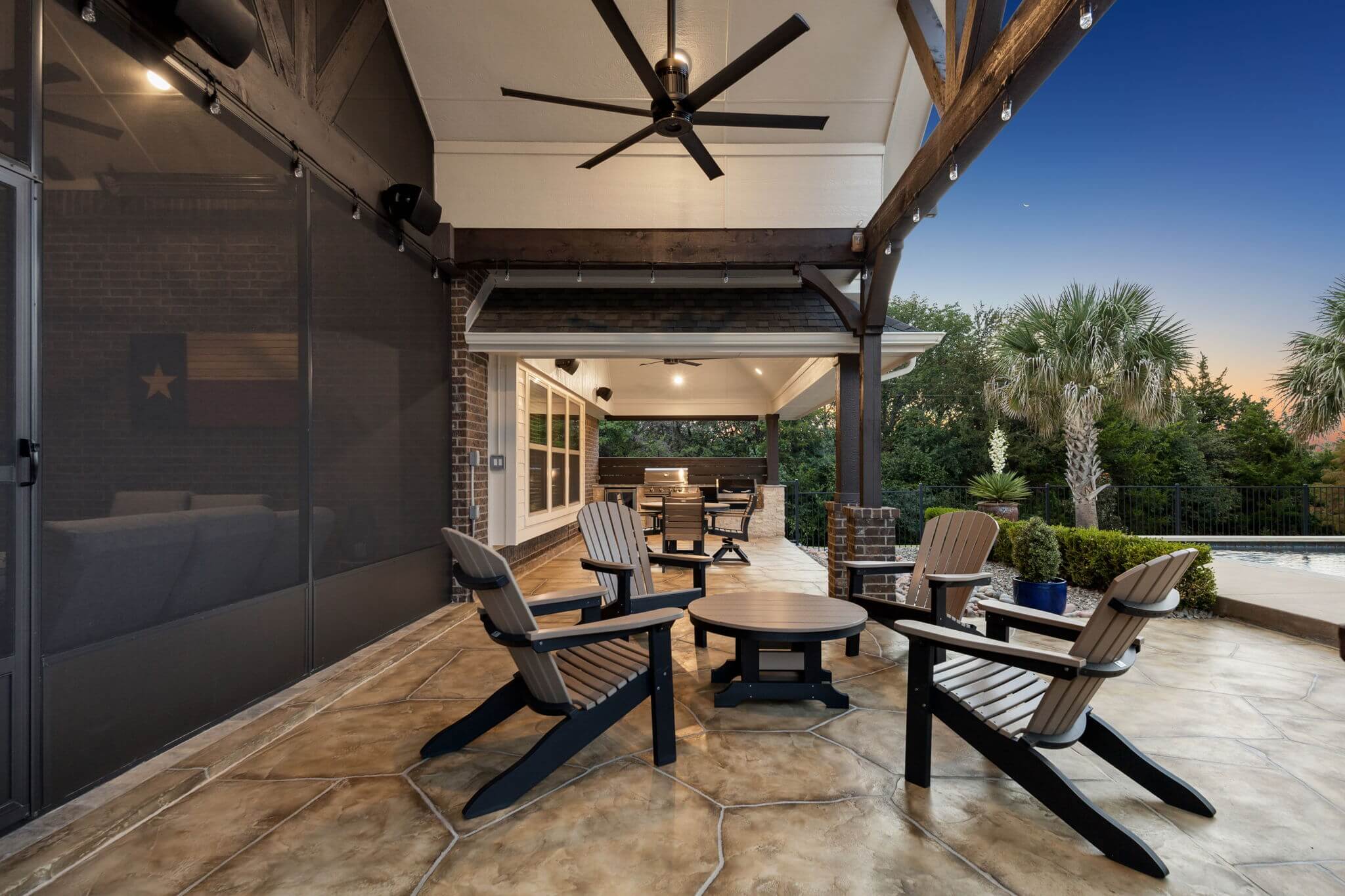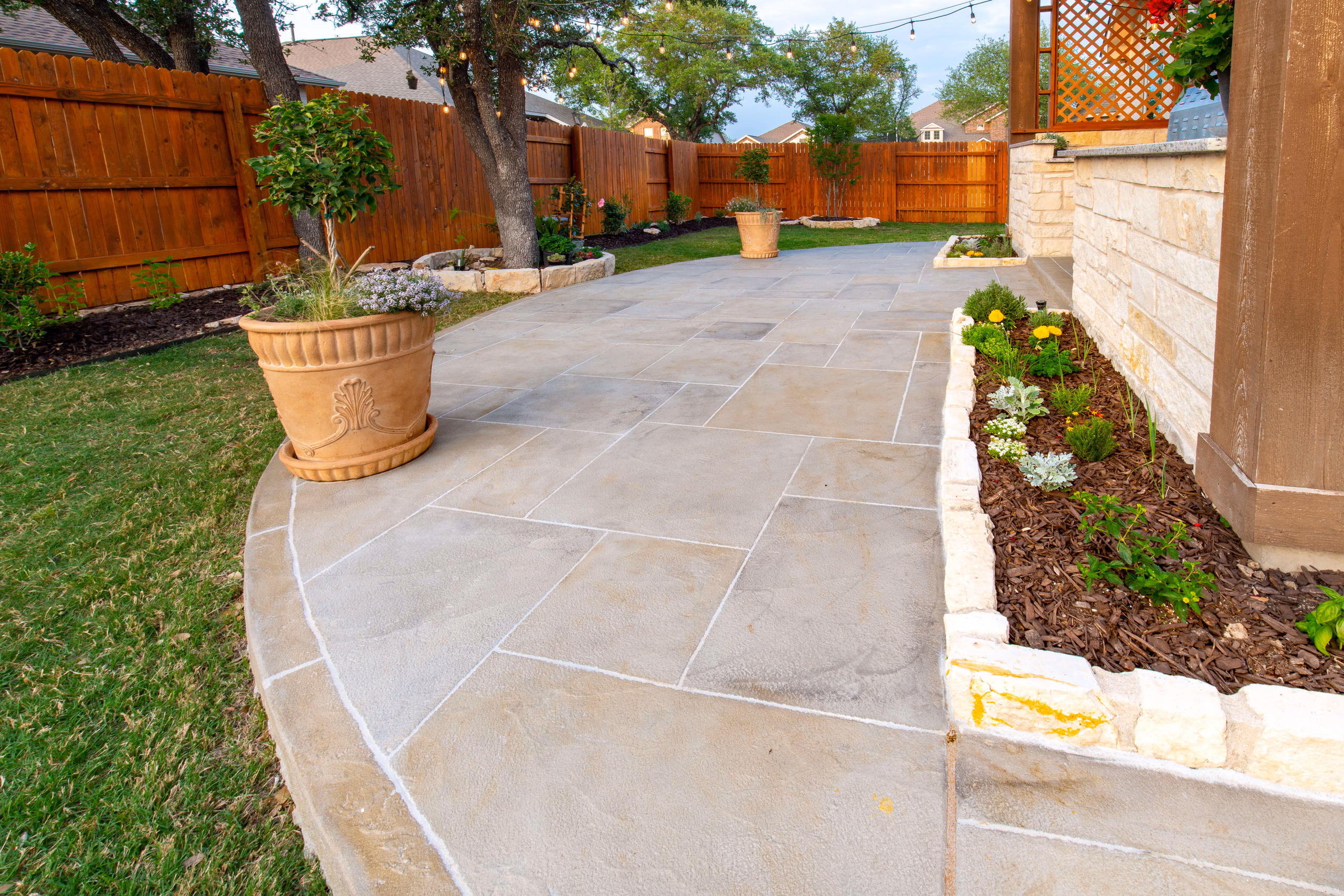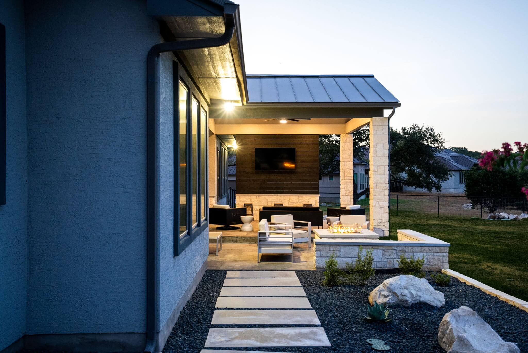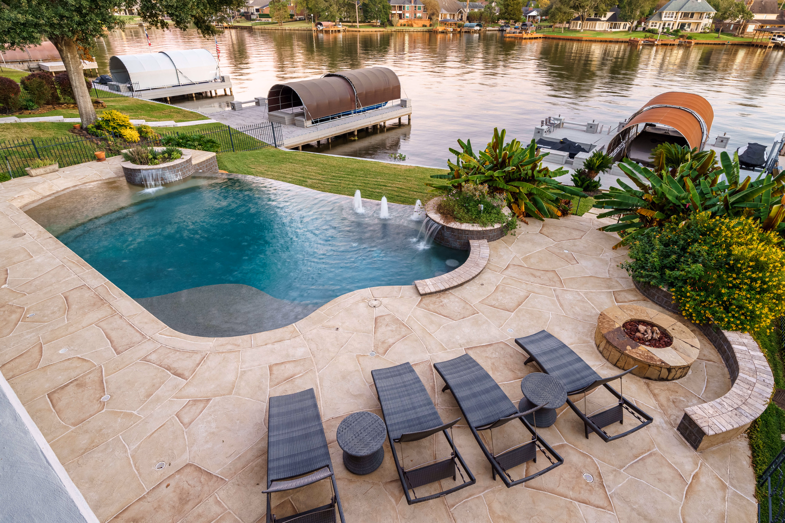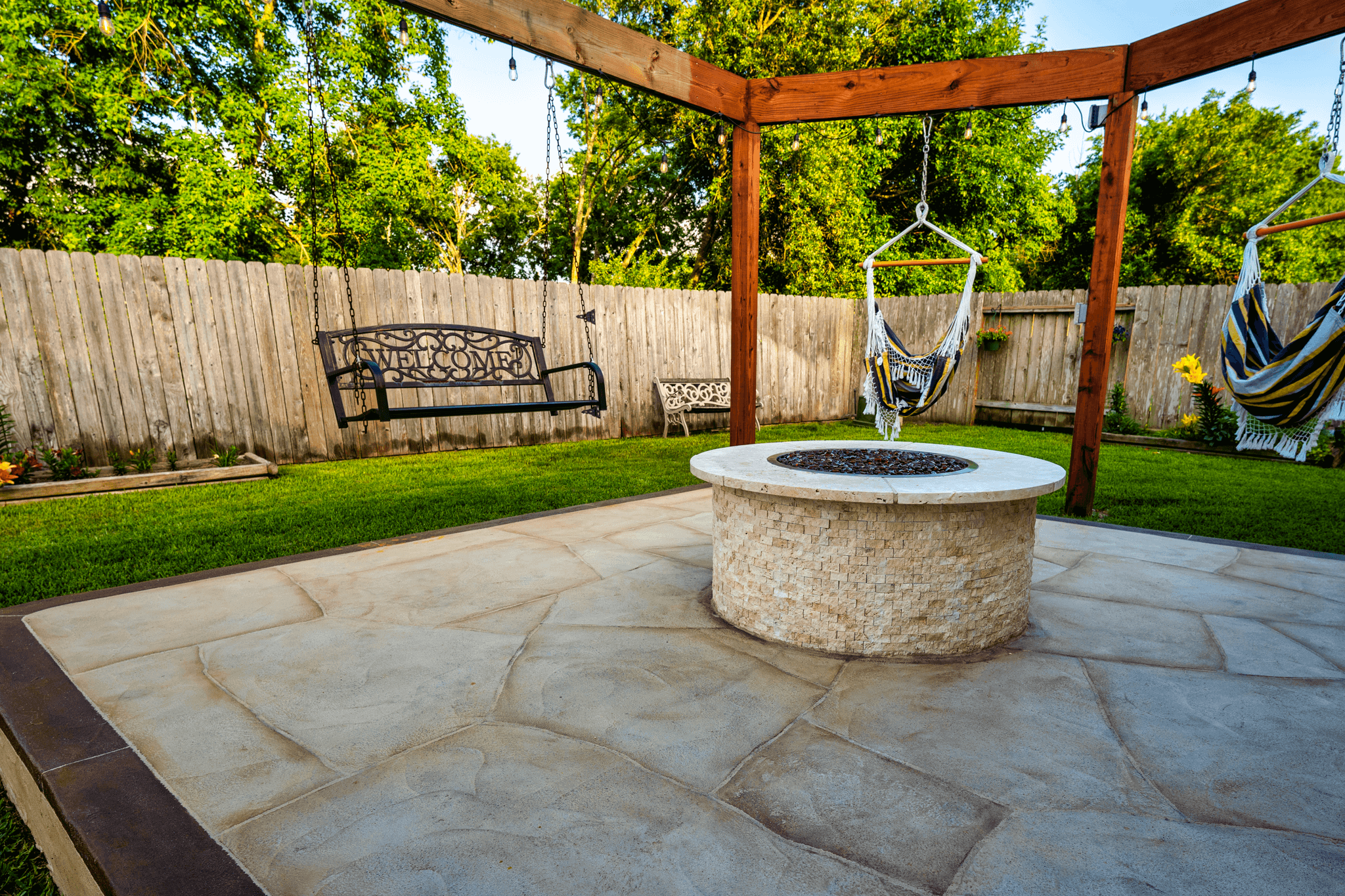 Lakeside Firepit & Seating WallComfortable Backyard PatioConcrete Patio in a Central Texas BackyardAluminum Patio Cover in Texas