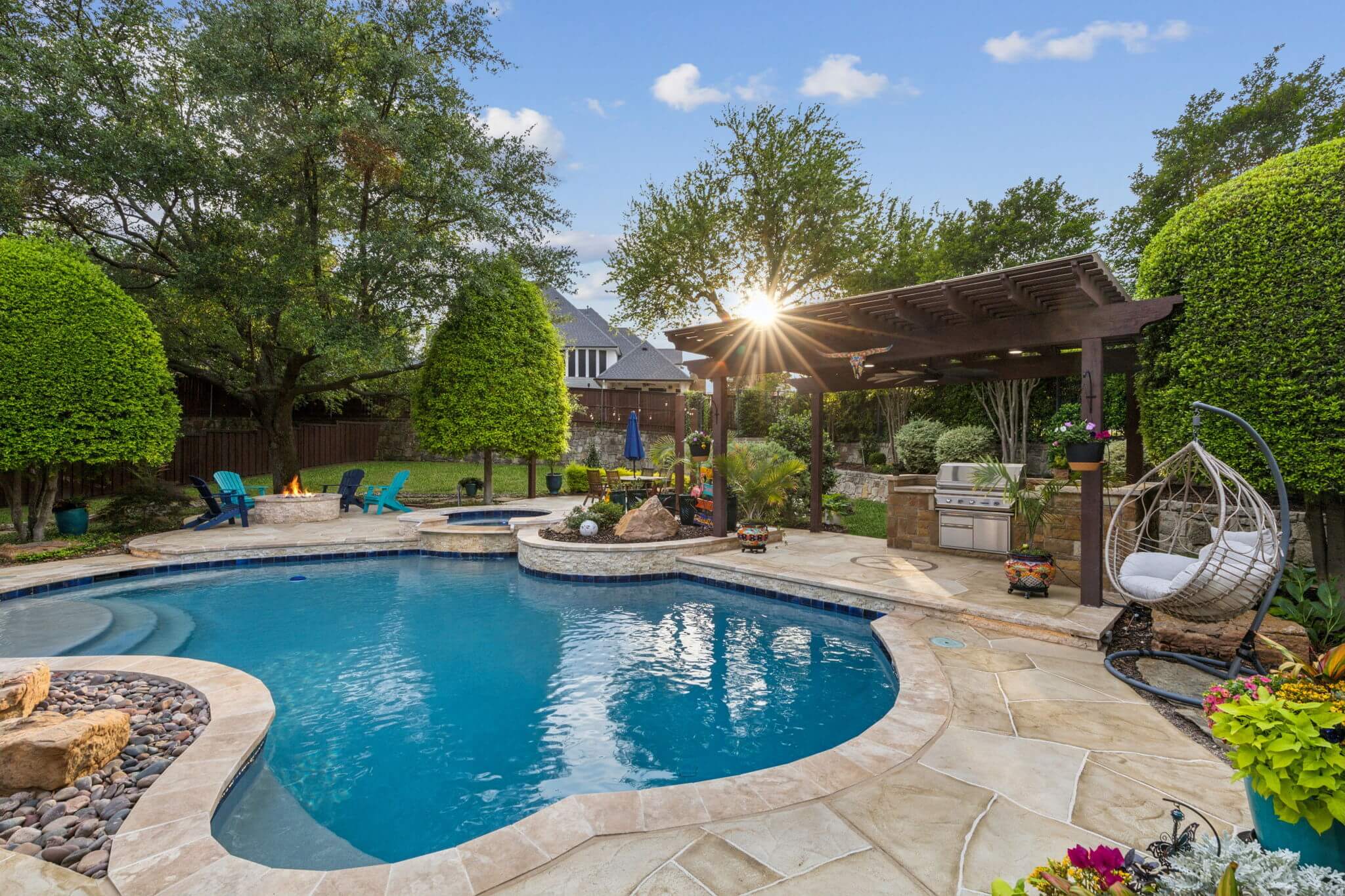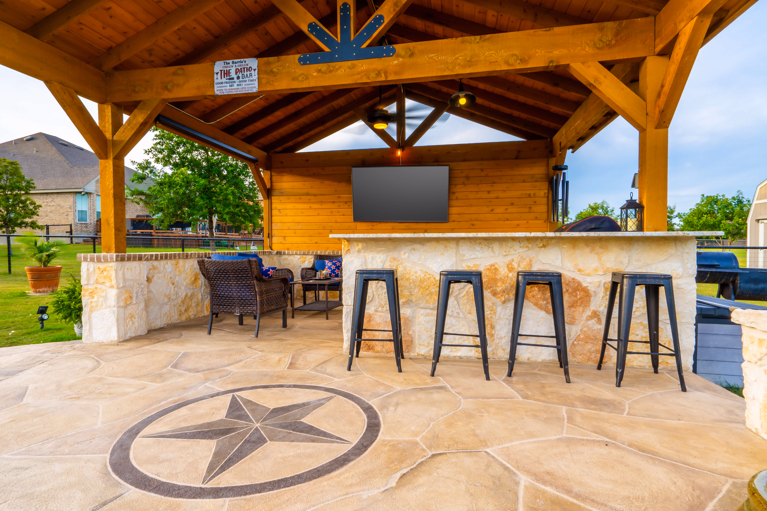Rustic Cedar Patio Cover & CarvestoneBeautiful Outdoor Living Oasis in Dallas, TexasCentral Texas Backyard RetreatTexas Family Backyard and Pool