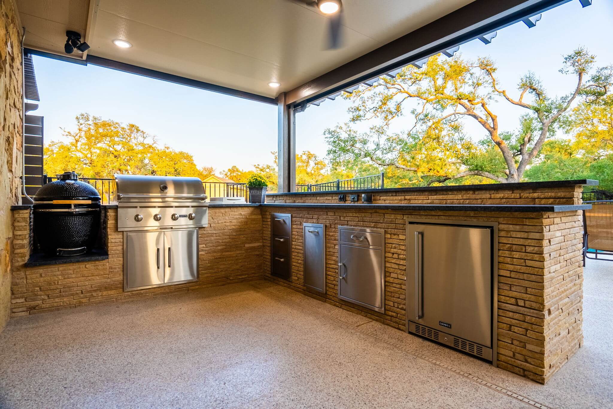 Outdoor Living RemodelCedar Patio Cover & KitchenCoastal Outdoor Kitchen & Patio StyleConcrete Patio with Kitchen & Privacy Wall