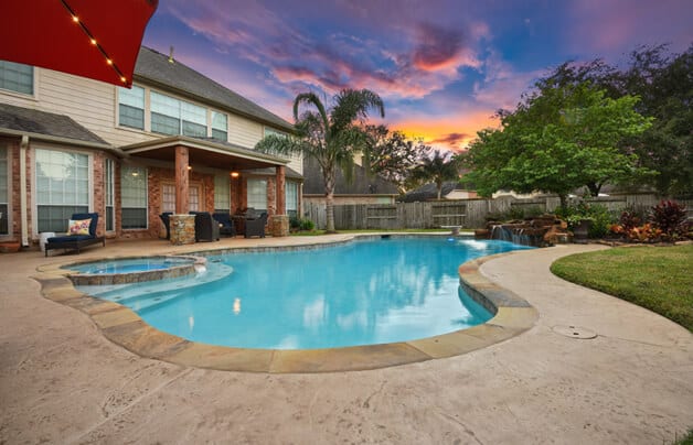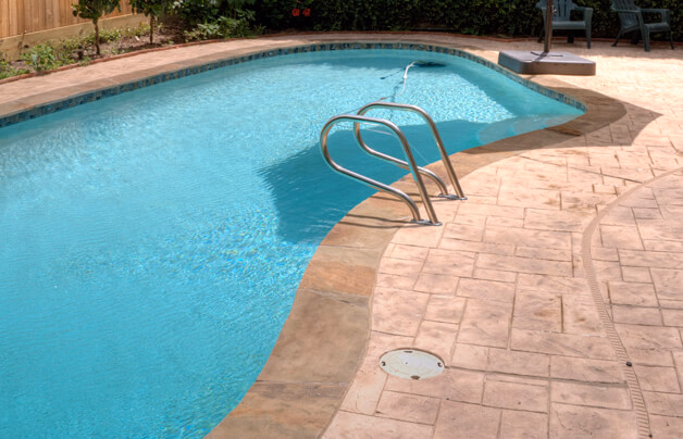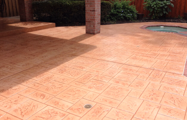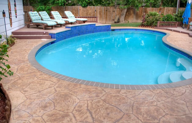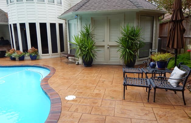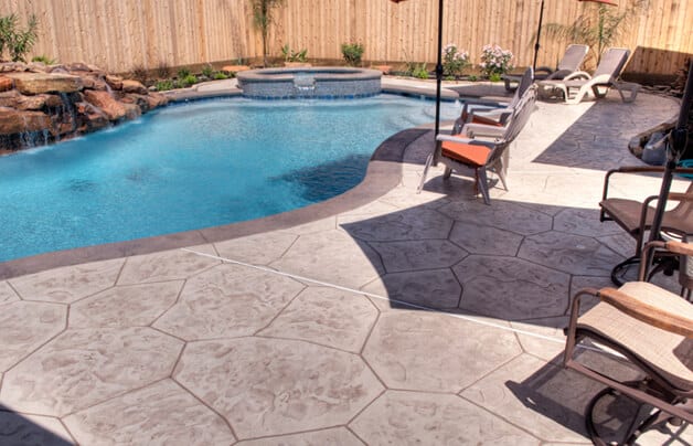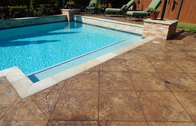Adding a decorative element to your concrete pool deck will change the feel of the entire space and adding a custom stamped pattern and color will be the final step in making your pool area look brand new again. In Texas, the temperature of the pool deck is something that should be considered. It’s with this in mind that we recommend using lighter colors in any area where you intend to be barefoot.