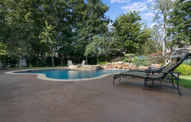 A freeform pool deck can provide a casual feel for a lazy Saturday afternoon. It’s generally utilized around a freeform pool and can create a level of cohesiveness throughout the yard. Alternatively, complementing a geometrically shaped pool with a similarly shaped pool deck is necessary to create a cohesive feel that allows the space to feel like it was all constructed at the same time.